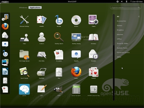 这是openSUSE第一次整合完整版本的GNOME 3桌面环境,包括GNOME Shell界面。A卡用户也可以注意一下,今天刚刚发布的催化剂11.11正式版已经初步支持openSUSE 12.1。
