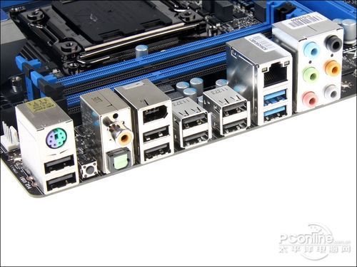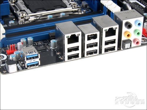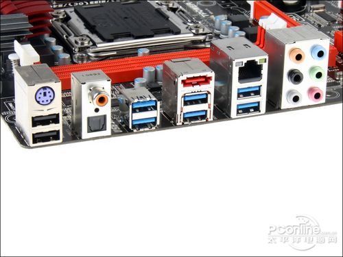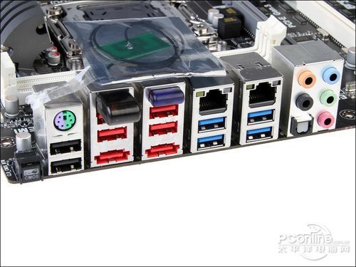 X79平台的处理器是没有核芯显卡的,因此不具备视频输出能力,这款主板的I/O接口主要以数据传输接口为主,包括3个黑色的USB2.0接口和1个白色的特殊USB2.0接口,6个第三方芯片主控的USB3.0接口,2个不同品牌网卡主控的RJ-45网线接口,2个高速的E-SATA接口,8声道音频和光纤音频。