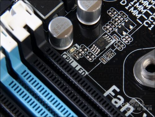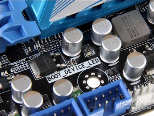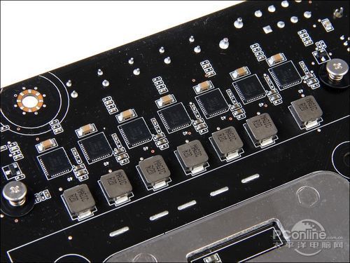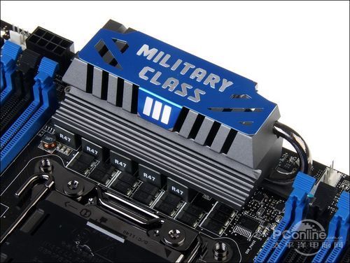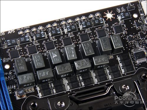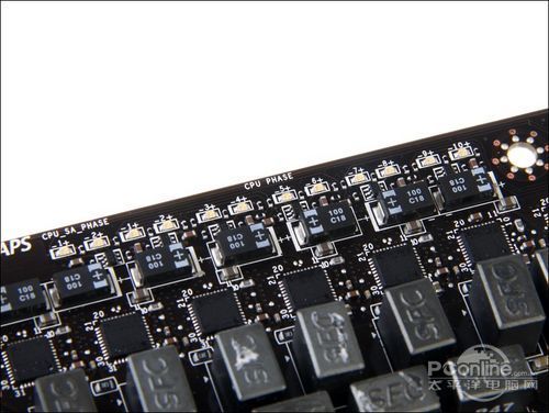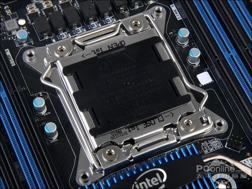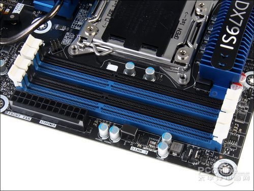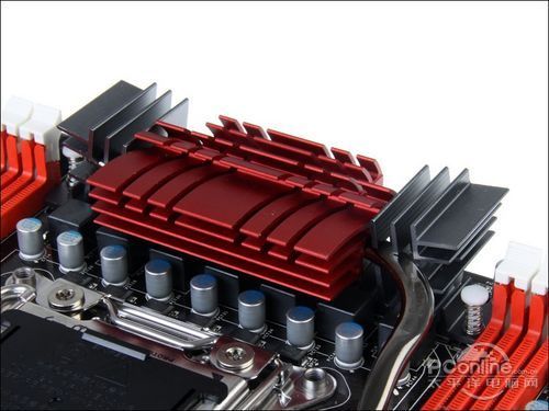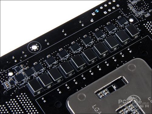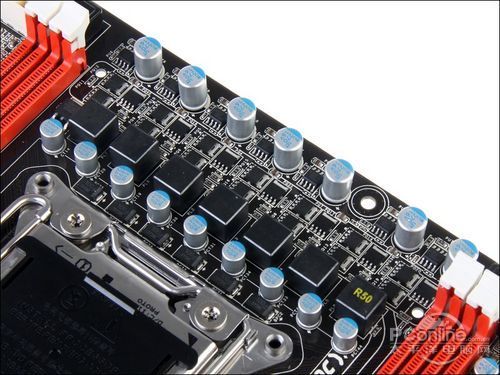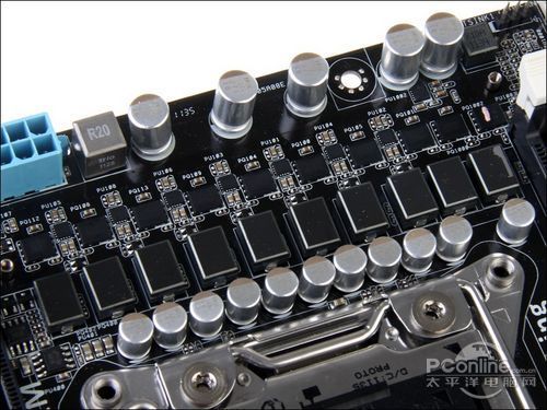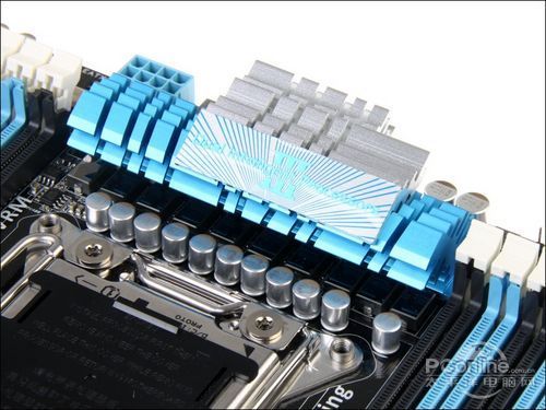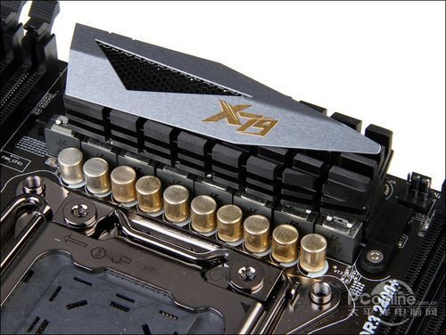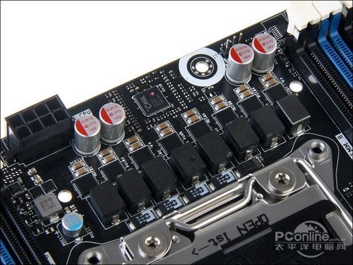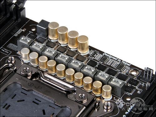 由于X79的内存插槽设置到了CPU插槽的两侧,因此X79的CPU供电只好稍稍改变了位置,设置到了CPU插槽的上方。