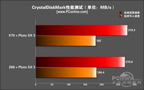 测试小结:规格上来说,Z68和X79都是配备2个SATA3.0和4个SATA2.0的单芯片设计主板,应该没有什么差距,实际测试成绩对比,两者的性能也的确没有差距,得分差距最大的ATTO Disk Benchmark读取成绩,换算成百分比来看,也不算什么,因此我们可以说,X79磁盘基本性能相对Z68来说没有提升,而且目前还少了智能响应支持。
