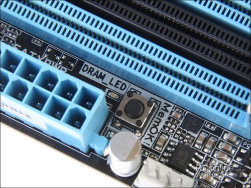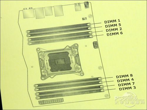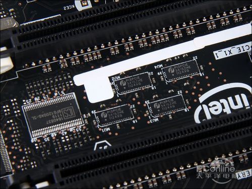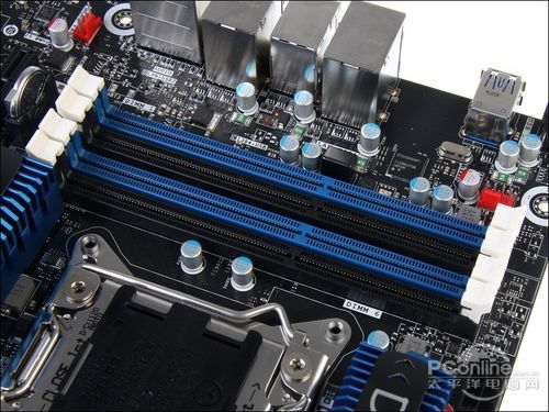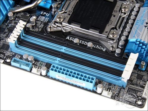 X79支持强劲的4通道内存,比X58的3通道更进一步,最大可扩展64G内存,容量和带宽都非常充裕。布局方面,这款主板在CPU插槽两侧各设置了4条内存插槽,左两条和右两条配对为一组,共蓝和黑两组,Intel官方推荐,要取得更高的内存频率,请把内存插槽蓝色的一组插槽中。