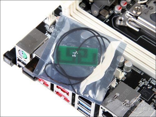 这款主板的WIF还设有简单的天线设计,感觉有点像手机的设计,可以黏贴到机箱上提升WIFI信号。