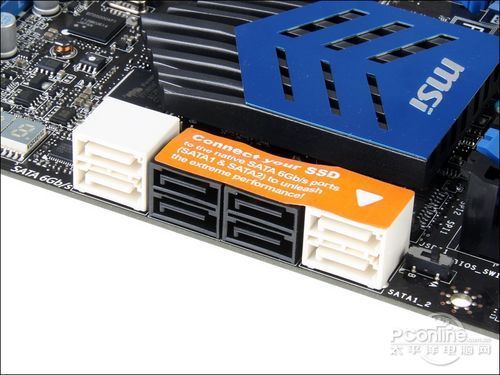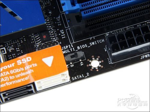X79芯片在平台的角色主要是南桥,华硕的这款X79提供了共8个SATA磁盘接口,其中上方无贴标的2个是6Gbps的原生SATA3.0接口,中间4个蓝色接口是3Gbps的SATAII接口,还有2个下方有贴得是第三方SATA3.0接口。
