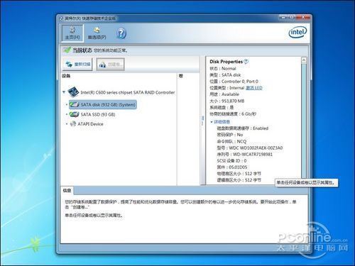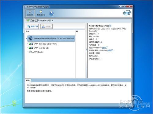 这一部分我们采用了科美Pluto SX 3 100GB固态硬盘来进行测试,Z68安装的是Intel的快速存储软件,而X79安装的则是企业版快速存储软件,都打开AHCI,都是用SATA3.0接口进行测试,其中,Z68不使用智能响应技术。下面我们先来看看X79的企业版快速存储软件。