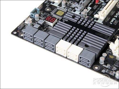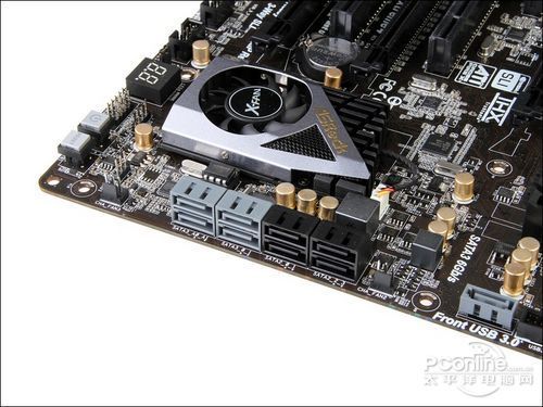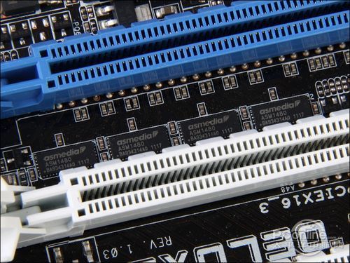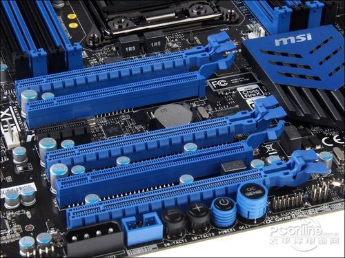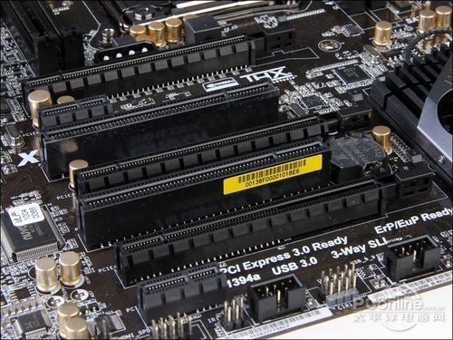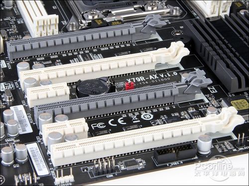 这款主板配备多达6条扩展插槽,其中4条是PCI-E x16显卡插槽,2条是PCI-E x1插槽,能够实现高性能的x16+x16双卡互联或x16+x8+x8的高性能三卡互联。另外,由于LGA 2011接口的处理器配备了PCI-E 3.0控制器,因此显卡部分是能够支持PCI-E 3.0的,而X79芯片扩展出来的部分则不支持。