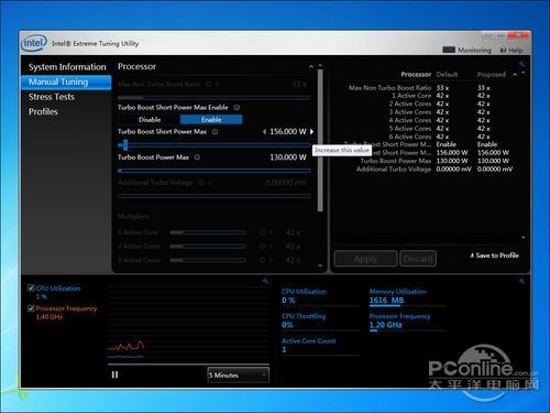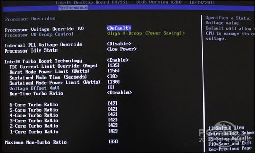 X79和二代酷睿同样采用了单芯片设计,一个是基于SandyBridge架构,一个是基于SandyBridge-E架构,因此它们的超频不少地方是共通的。我们可以调整TurboBoost的TDP限制并调整CPU的外频上限进行超频。这可以在BIOS设置界面下实现,也可以进入系统后在相关超频软件中实现。