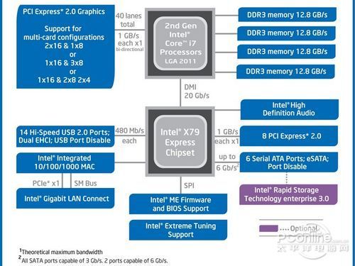接下来,我们再看看Intel给出的最新的X79架构图,总的来说,对于处理器和内存的规格,我们还算是满意的,不过这主板,实在不给力。