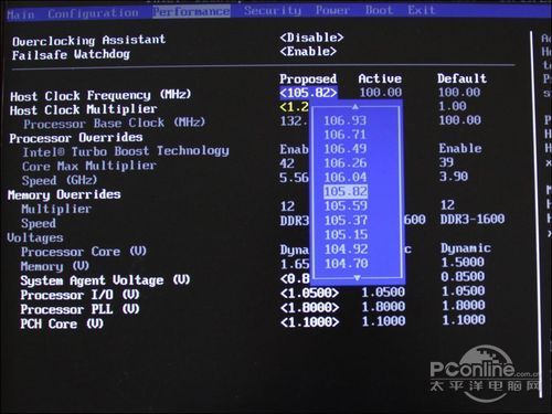 对于i7 3960X这款解锁版的处理器来说,最大外频可以设置到57,而无解锁的处理器最大也能设置到45,调整幅度还是不错的。