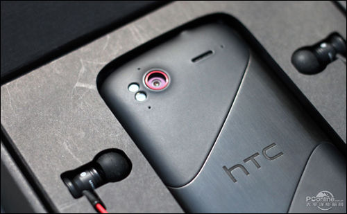 HTC Z715E(Sensation XE)的背后设计也完全基于G14,不过全新的配色显然看起来跟顺眼,两端黑色呈磨砂质感,中间暗银色让LOGO的气质很金属很硬朗。为了配合下方的Beats audio LOGO,上方的摄像头也刷成了酒红色,整体协调了很多。摄像头仍为800万像素摄像头,另附带两个LED补光灯,支持1080P视频录制。