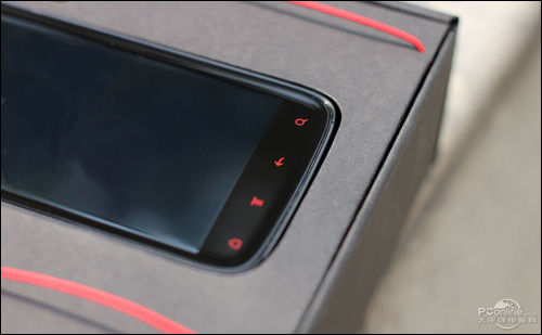 HTC Z715E(Sensation XE)机身以黑色为主调,但因为加入了Beats的元素,当然要带点红,这样一来,张扬的红黑配色便出现了。虽然整体与G14造型依然相差不远,但把上方的听筒和4枚触摸键刷成了红色之后,整个感觉就完全不一样了。更朝气、更激情,这应该是最恰当的形容。