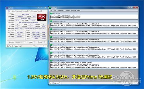 我们采用华硕Crosshair V Formula进行超频,由于不锁倍频,我们用最简单的超频方法:超倍频+只提高CPU电压。默认3.3GHz,目标是4.5GHz,经过调试,倍频设定22.5x,CPU电压从默认1.2V提升从1.35V即可达成。成功进入系统,并通过Prime 95烤机测试,初步验证超频稳定。