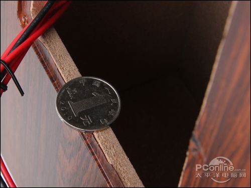 从打开的低音炮背面,我们可以看到音箱木板的贴皮厚度。我们拿了一个一元硬币做对比,木板厚度大概有半个硬币左右宽。木板硬实,材质不错。