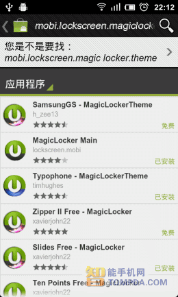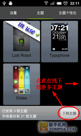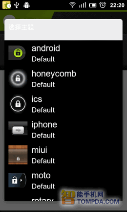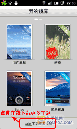 当设置完毕魔力锁屏软件后,可通过软件提供的“主题”功能,选择一款自己喜欢的主题,或者使用软件提供的“下载主题”功能,可以跳转到Market电子市场或魔力锁屏官方下载最新的锁屏主题。