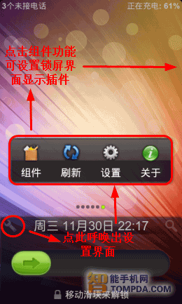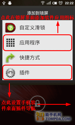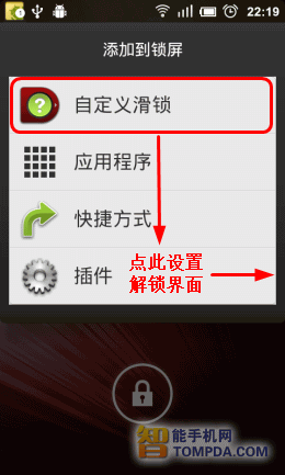 当使用Widget Locker软件锁屏时,直接长按锁屏界面,即可呼唤出添加插件功能。通过软件提供的“自定义滑锁”功能,便可设置解锁效果。