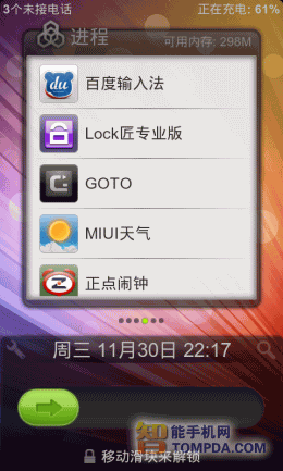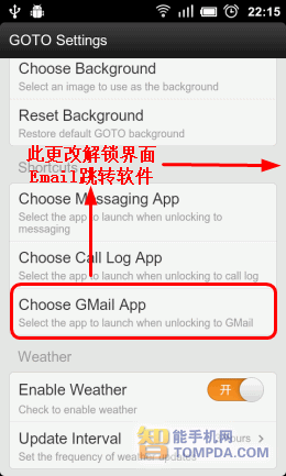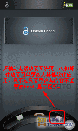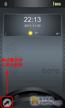 GOTO锁屏在解锁时,需要你按住解锁模块,滑动到最右端解锁,而当你滑动解锁的时候,会注意得到,每向右滑动手机屏幕,就会出现一个快捷导航提示框,如“短信、电话、Eail”功能,想要替换这些功能,可以通过软件提供的“设置”功能,来更换解锁界面的软件程序。