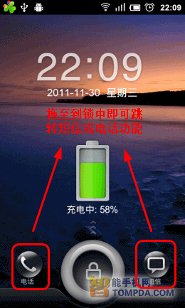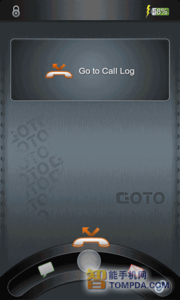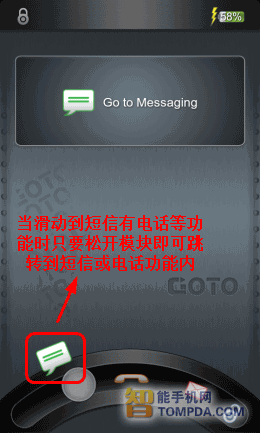 当我们使用GO锁屏软件,解锁的时候,还可以通过软件在锁屏界面,提供的快捷导航功能,在解锁的同时跳转到“电话或短信”功能。