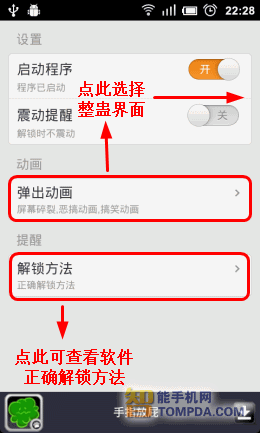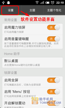 魔力锁屏软件不像GO锁屏软件那样,需要你再下载与之匹配的主题软件,才能使用软件。直接打开魔力锁屏软件,即可设置锁屏时的一些效果,比如是否“启动全屏、解锁震动”等。