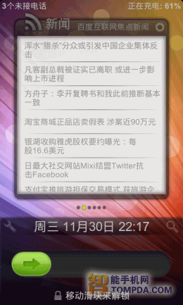 在使用摸手锁屏软件,锁住手机屏幕时,可以直接通过锁屏界面,了解到“当前城市天气情况、实时新闻资讯、日历”等信息。
