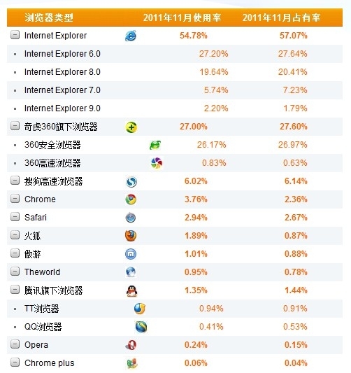虽然近年来出现明显下滑,但是IE仍然占据着我国浏览器半壁江山,其中IE6高达27.64%的占有率以及27.20%的使用率更是令IE9望尘莫及。紧随其后的是奇虎360安全浏览器、搜狐高速浏览器。
