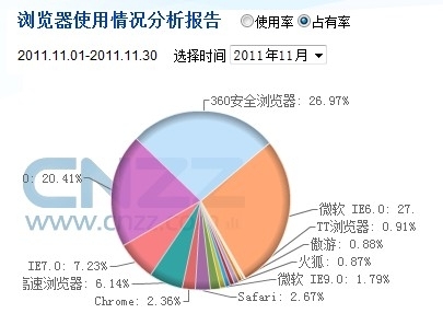 CNZZ数据中心日前公布了我国浏览器11月份使用情况分析报告,相比全球浏览器市场格局,我国浏览器排行榜是独居特色的。尽管微软大力劝导大家抛弃IE6,但是从11月我国浏览器统计数据来看,IE6仍然是我国用户使用最多的一款浏览器。