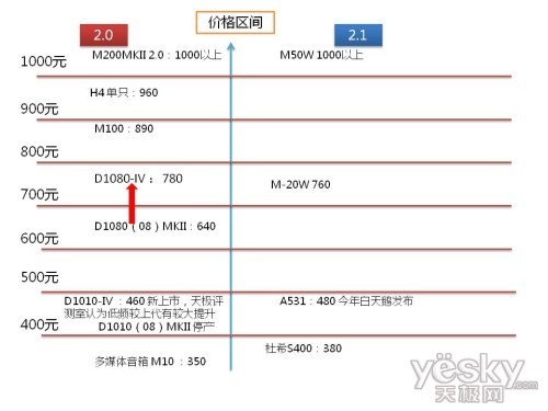 从上面的图标分析来看。惠威(HiVi)将自己的产品线做一定的调整。在600-1200之间,惠威(HiVi)布置了 D1080 IV、M100、M200 MKII,这样一个高低搭配的组合。每个阶梯差价都在120-150的样子。这个样子一个黄金组合搭配,构成了其他企业竞争的极高的门槛。其中,M200 MK2作为惠威(HiVi)的经典中间的经典,很多国内消费者,发烧友都是伴随着M200 MKII讨论进入到HIFI的圈子,这对箱子在消费者心中有一种标杆的作用。销售量、保有量极大,各种音色调配,打磨都围绕着这对箱子。