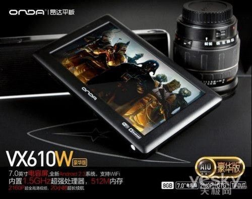 昂达VX610W豪华版采用国内平板中领先的A10方案,搭载主频最高可达1.5GHz的强劲众核芯片,性能较国内其它市售平板提升25%以上;512M DDR3缓存、独立的Mali 400显示芯片等顶级配置,让机器运行更为流畅、稳定;采用了7.0英寸的新一代高清五点触摸电容屏(800×480分辨率),操作体验绝佳;内置Android 2.3.4智能操作系统,全面兼容95%以上的Android应用程序、游戏,让你尽享智能娱乐生活。
