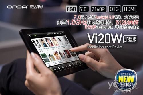 昂达Vi20W加强版是国内首款针对中高端市场而打造的A10平板。昂达Vi20W加强版拥有如强劲的1.5GHz众核处理器、2160P超全高清视频、超长续航等众多卖点,同时融入了7.0英寸4:3高清屏幕、五点电容触摸操作以及1080P HDMI双屏视频/游戏显示、外接3G上网等功能。现在这款新品已热销了一段时间,良好的销量证明了它的品质,8GB仅售699元,是追求更佳平板体验的用户的首选。