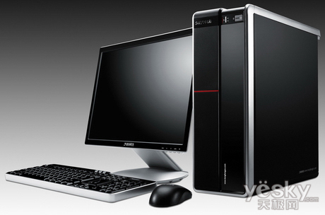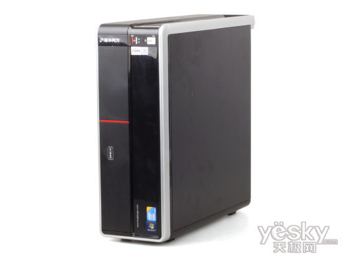外观方面,该机采用传统的塔式设计,主机通体都采用了黑色,显得稳重坚实。主机的线条采用了大量的直线,十分硬朗。主机正一方有一个向后倾斜的 档板设计、电源按键就设在这里,同时它的背后隐藏了一个把手,让搬运主机显得很方便。光驱、读卡器接口、USB和音频插孔自上而下分布在前面板上。正面偏 右边的部分有很长的一排散热出风品,看上去也很威武。显示器的风格与主机保持了一致,条纹形的OSD操作按钮很别致。