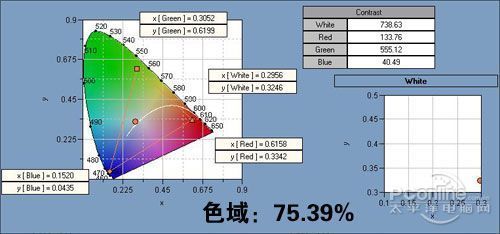 小结:HKC G2631的亮度为226.02cd/㎡,相对于26英寸的大屏幕而言,略显得偏低,而对比度730:1的值,表现也不优秀,部分场景的静态对比度表现一 般,而且色域75.39%还是比较不错,在同等TN面板的产品中还是显得优胜,而色温7598K显得偏高,偏高的色温会使画面显得偏蓝紫色。
