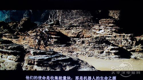 远景表现中,显示器色彩对比中规中矩,机器人与背景石块的对比明显,画面清晰。
