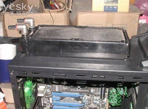 在水冷散热中,热量将通过散热排排出,所以为了降低机箱内部热量的积累,散热排一定要放在机箱外。不过多数机箱都不会在外部提供散热排安装位,所以在改造之前一定要考虑好散热排的摆放问题。网友这次改造把散热排就固定到了航嘉暗夜公爵III顶部。建议有条件的朋友在机箱顶部打孔,加螺杆固定。当然对于象航嘉暗夜公爵III这样支持水冷散热的机箱来说,也可以不用考虑额外加固。