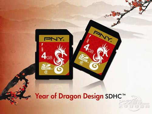 除了U盘,PNY还推出了龙年纪念版闪存卡,闪存卡容量为4GB,这样的容量不大,但很大众化,而且在存储的影像数量上也可以给广大用户们一个可靠的保证。龙年纪念版闪存卡的制造完全符合SD协会定制的SD 2.0标准,同时提供自动错误改正 (ECC) 功能,侦测和修正错误,内建防写开关,防止资料的意外丢失,降低耗电量、延长您装置的电池寿命。