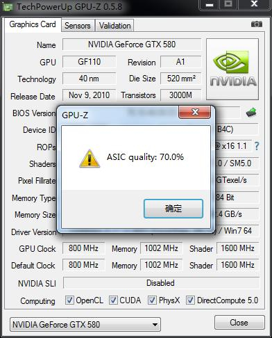那么,这个芯片质量(ASIC quality)究竟意味着什么呢?前边已经说过,GPU芯片会在进行封装之前检测,一句不同的体质做成不同型号规格的产品,而检测依据就是晶体管的漏电率,漏电率越低则说明芯片体质越好,这样一来可以制成较高级别的产品。GPU-Z正是根据这一特性来检查芯片体质。