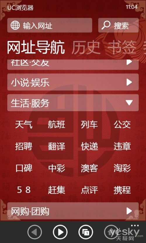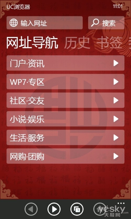 UC浏览器相信各位也不会陌生,作为长期从事手机端浏览器开发的软件商,UC是比较早登陆Windows Phone平台的浏览器,笔者体验下来,UC虽然像百度浏览器的效果那么炫,但速度方面还是略胜于后者的。