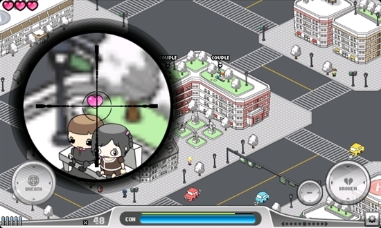 游戏采用的是重力感应控制的第一人称射击模式,屏幕上会出现一个卡通风格的大街,里面隐藏有若干对情侣在压马路或者幽会,你要干的就是打开狙击枪,用重力感应把准心对准他们,然后Hold住了开火。注意有时间限制。