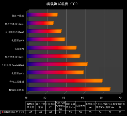 更令人惊喜的是,采用双U形热管的七星瓢虫V2与V4在性能表现上完全可与采用双热管与四热管的同结构散热器产品抗衡。在配合10CM大尺寸风扇情况下,七星瓢虫V2甚至可超越采用两条6mm热管的九州风神GAMMA200散热器。而仅仅采用两条“双U”形热管的七星瓢虫V4虽在成绩上稍有落后于四根热管的九州风神西塔400与酷冷至尊旋风V4+,但客观来看两条热管产品在性能表现上基本可以达到四条热管产品的性能表现,这实属不易。