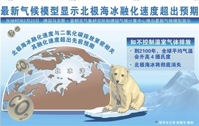 据新华社电 德国马克斯·普朗克气象研究所和德国气候计算中心23日推出的最新气候模型显示,北极海冰融化速度与二氧化碳排放紧密相关,北极海冰融化速度超出先前预期,如不控制温室气体排放,北极海冰将彻底消失。