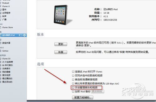 ② 在iTunes设备摘要中勾选“手动管理音乐和视频”。