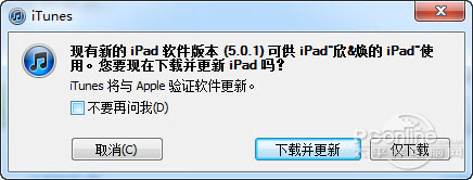 在默认情况下,每次当用户将设备连接好,iTunes都会自动检测接入设备的系统有无更新版本,当检测到有更新版本时,就会提醒用户进行升级操作。用户只需要点击“下载并更新”按钮就可以将iPhone或iPad的版本(操作系统)升级到最新版本。