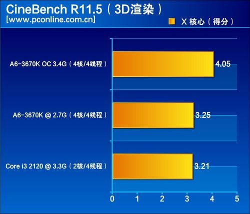 测试小结:应用软件测试中,在WinRAR上,Intel的Core i3 2120凭借Sandy Bridge的优势领先。但是到注重多核心的应用,比如3D渲染,拥有物理四核CPU的A6-3670K优势就显现了,超频后更是以较大幅度抛离i3 2120。