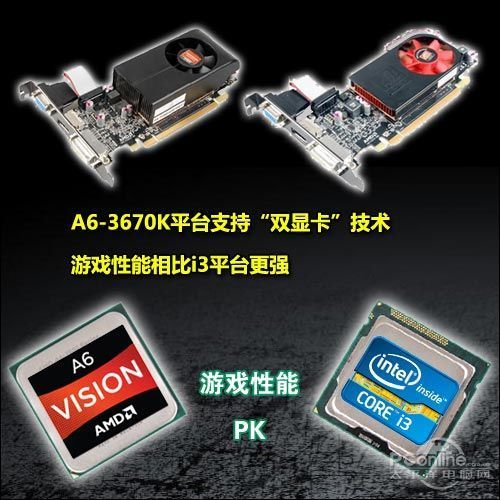 【PConline 横评】备受关注AMD A6-3670K黑盒处理器正式铺货,这款支持CPU与GPU“双超频”的APU,通过简单的超频设置,即可使性能免费提升一个档次(点击查看相关评测)。但是,A6-3670K的杀招不止这个,还有“双显卡”技术,与AMD入门独立显卡交火,3D性能再度提升。