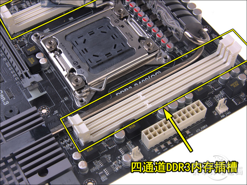 内存插槽方面,主板配备4条DDR3 DIMM内存插槽,支持全新的4通道规格,内存带宽充裕。此外它还具备强劲的高频内存支持,最高能支持2500MHz(oc)的DDR3内存。