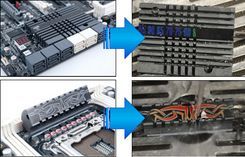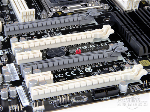 主板一共提供6条扩展插槽,分别是4个PCI-E X16和2个PCI-E X1插槽,其中黑色PCI-E X16标准显卡插槽真正支持PCIe 3.0规范,可以组成X16+X16二路SLI/交火或者X8+X8+X8+X8四路SLI/交火