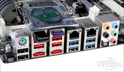 这款主板提供了丰富的I/O接口,包括1个PS/2键鼠混合接口、6个USB2.0接口、4个USB3.0接口,光纤音频接口、2个RJ-45网线接 口、2个E-SATA 3.0接口和8声道音频接口,此外还有一个清空BIOS的微动开关,一个蓝牙发射器和一个WIFI发射器。