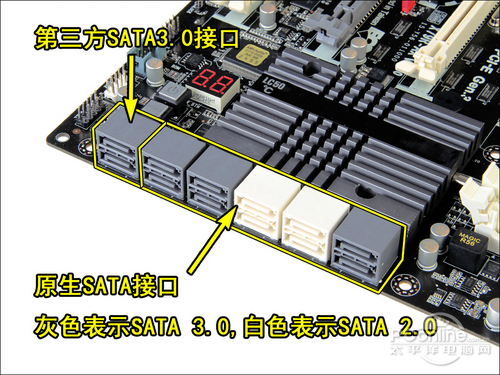 主板原生支持10个SATA接口,其中包括6个灰色的SATA3.0接口和4个白色的SATA2.0接口,能够组建RAID 0/1/5/10多种磁盘阵列模式,除此之外还有2个采用ASM1061第三方芯片的灰色SATA3.0接口。