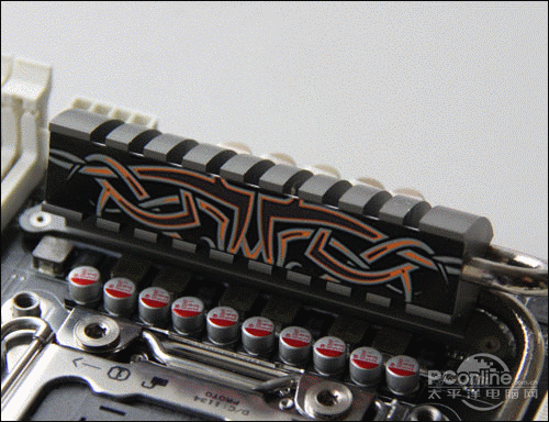 精英X79R-AX采用标准ATX架构,配色以黑白两色为主,其外观最显眼之处在于供电部分和PCH芯片的散热设计,精英官方将其命名为“变色龙”,能感应温度变化而变色,PCH芯片上的散热器还能感温显示数字温度。