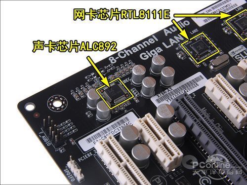 声卡方面采用的是Realtek的中高端产品ALC 892,支持完整的蓝光音频接口,回放质量优秀,而且录音质量也不错。板载双网卡设计,采用两颗Realtek RTL8111E网卡芯片,为多网并联或网络共享提供便利。