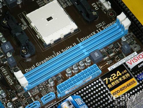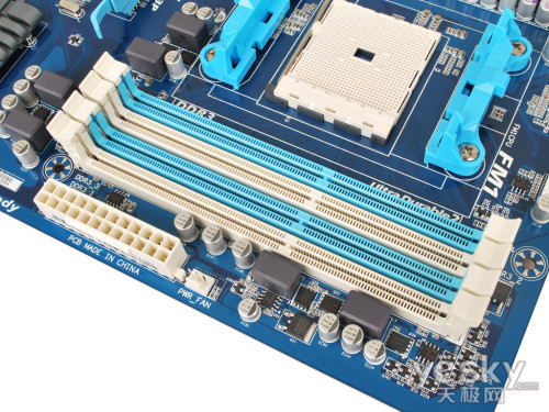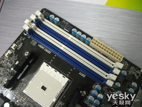 主板提供了四根DDR3内存插槽,采用了两相独立供电,最高可以支持DDR3 1066/1333/1600/1866MHz规格,最高支持容量到32GB。