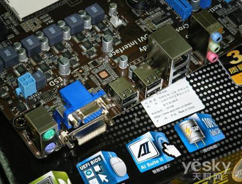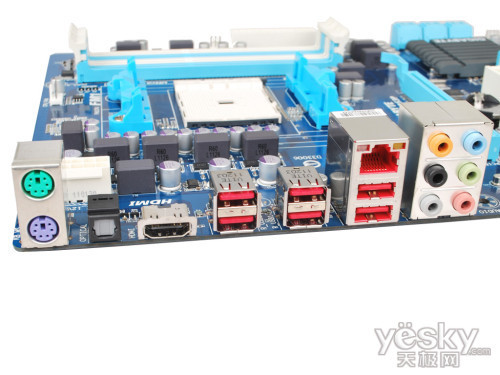 主板I/O部分:提供了2个PS/2接口、VGA、HDMI、光纤 SPDIF 数字音频输出端口、4个USB2.0、2个USB3.0、7.1声道输出和一个eSATA接口。