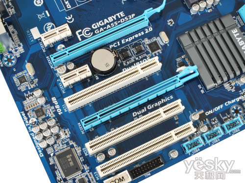 扩展接口方面,主板提供了两条PCI-E X16插槽,两条PCI-E X1插槽以及三条PCI插槽,支持APU与HD6670级别独立显卡或者双独显组成混合交火模式,从而进一步提升显示系统的性能。丰富的PCI扩展槽也方便用户接驳各种扩展设备。